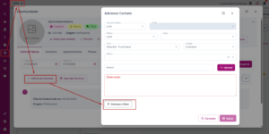 Ao clicar em Adicionar, você verá a opção “Comece a falar”, que permite que a IA realize a transcrição automática das informações. O conteúdo transcrito será salvo no histórico do cliente em formato de texto, garantindo fácil acesso e registro organizado.