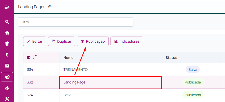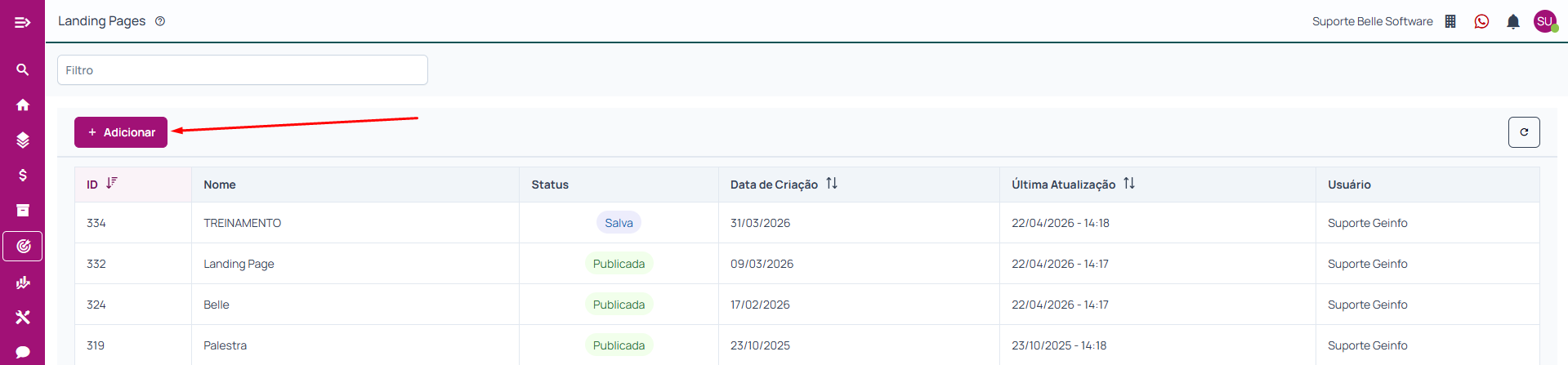 Acessando o programa Landing Pages, no canto esquerdo abaixo clique no ícone para inclusão, mas caso já tenha alguma cadastrada irá listar em tela conforme filtro aplicado:
