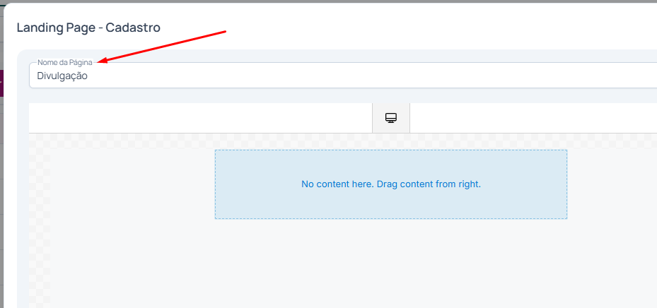 Na primeira guia é onde será realizada a criação da página, o primeiro campo solicitado é o nome, que você usará para identificação posterior em seu sistema: