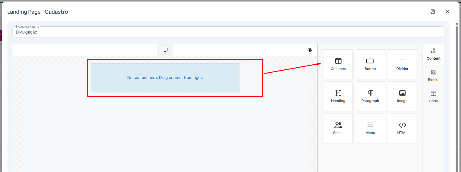 Após definição do nome, já pode iniciar com a montagem da sua página. A tela estará dividida em duas partes, o painel onde montará e visualizará como está ficando e ao lado o campo de elementos que utilizará para montar: