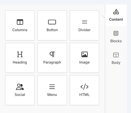 As opções de conteúdo são amplas e permitem que você crie uma pagina completa, com a divisão de colunas, inclusão de títulos, botão, menu entre outros elementos disponíveis.