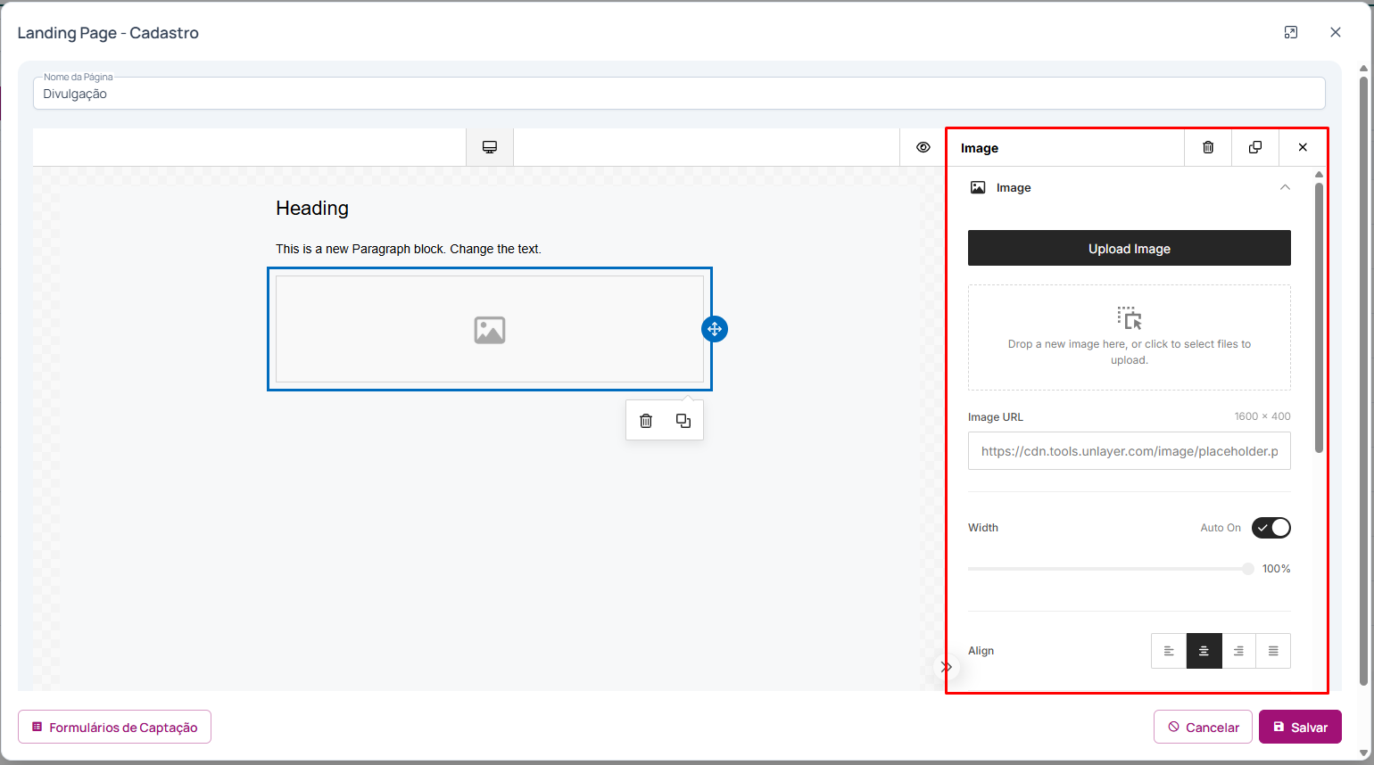 Conforme arraste um elemento, ao clicar sobre ele abrirá ao lado opções de personalização, no exemplo abaixo em que foi selecionado uma imagem ao clicar sobre ela abrem opções ao lado de personalização.