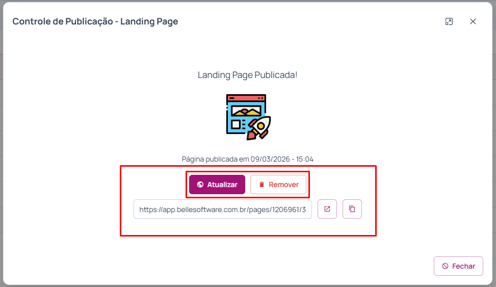 Após publicar, ficará disponível o link da página e as opções para Atualizar Publicação/Remover Publicação:
