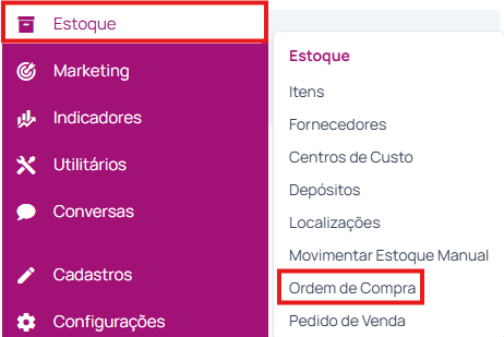Inicialmente você precisa fazer parte do grupo Administrar de Estoque para que o menu de Estoque e junto à ele, o programa correspondente às ordens de compra estejam disponíveis: