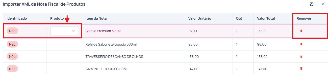 Neste momento o sistema irá identificar os produtos contidos na nota fiscal e, caso possuam o mesmo nome dos produtos cadastrados no sistema, eles já serão selecionados, caso contrário, você poderá buscar os produtos ou remover, caso seja algum item que não queira lançar no momento: