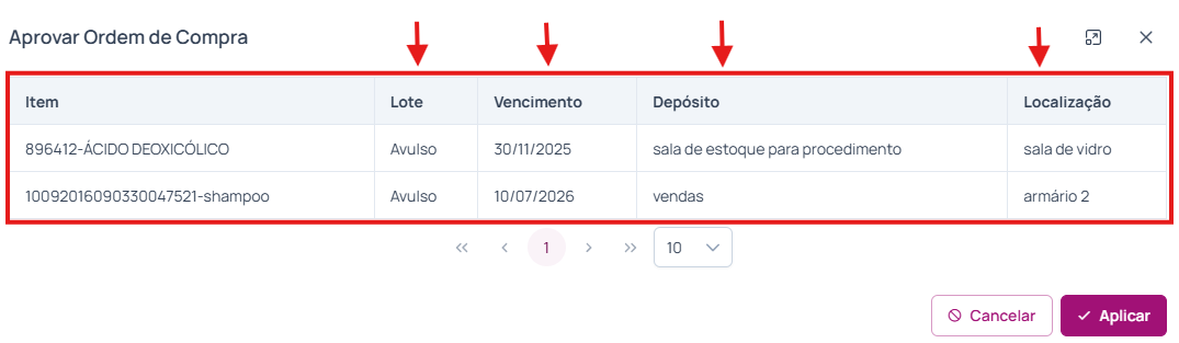 Ao selecionar a ordem de compra, basta clicar sobre Aprovar e o sistema trará uma mensagem solicitando se “Deseja realmente aprovar esta Ordem de Compra?”, basta clicar sobre “Sim” e então a primeira etapa da aprovação será disponibilizada, onde as datas de vencimento de todos os itens deverão ser preenchidos. Para isso, basta dar um duplo clique sobre o campo de vencimento para informá-lo, fica também disponível o lote dos itens, o qual por padrão virá como “Avulso”, mas pode também ser alterado se necessário.