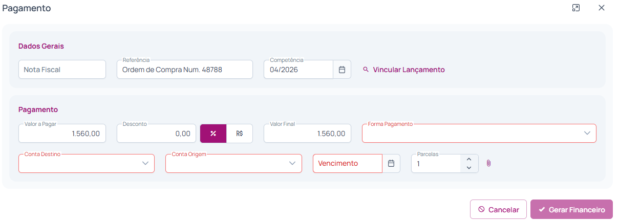 E abaixo, há os campos para o lançamento da conta a pagar, basta fazer o preenchimento de acordo com forma de pagamento a ser utilizada e número de parcelas, e o lançamento financeiro será realizado.
