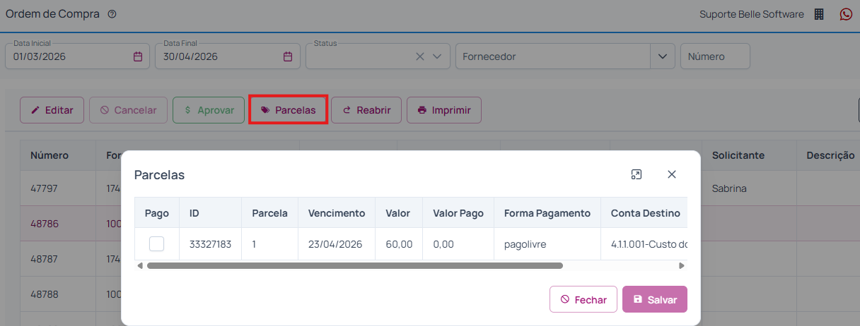 A consulta das parcelas lançadas através da ordem de compra, pode ser feita através do Controle de Contas a Pagar, ou ainda, na própria ordem de compra há esta possibilidade. Basta selecionar a ordem a qual deseja-se verificar as parcelas, e clicar sobre a opção de Ver Parcelas: