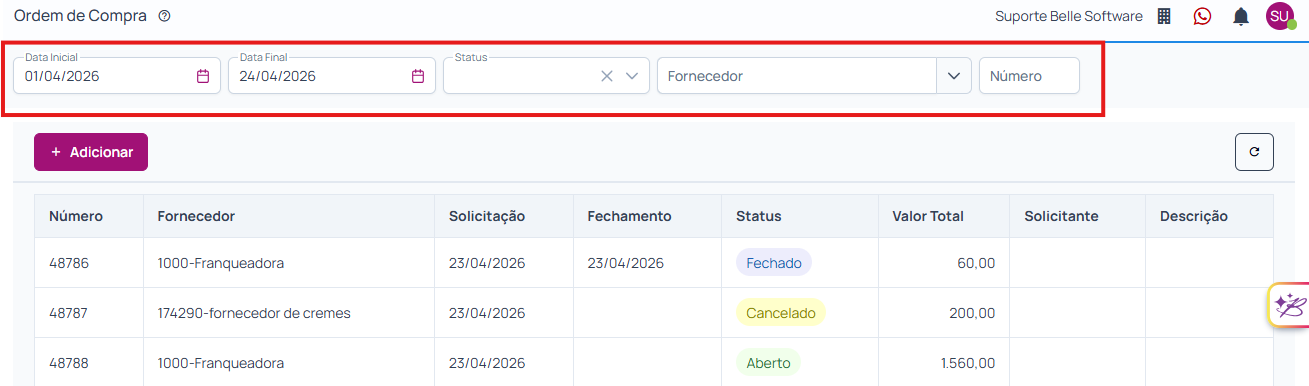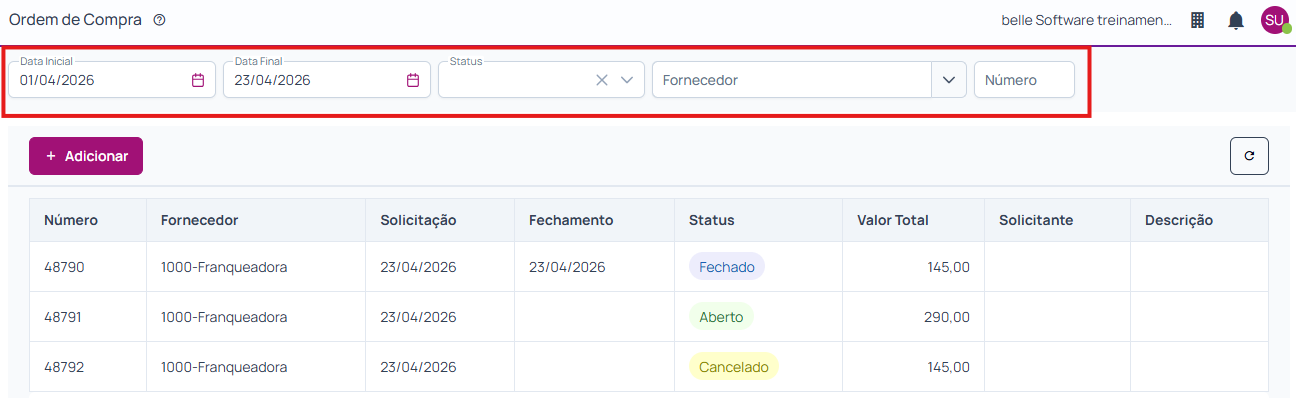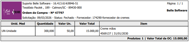 Após realizar os cadastros e parametrizações do módulo de estoque, você poderá emitir as ordens de compra utilizando o Belle Software.