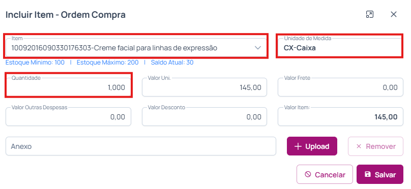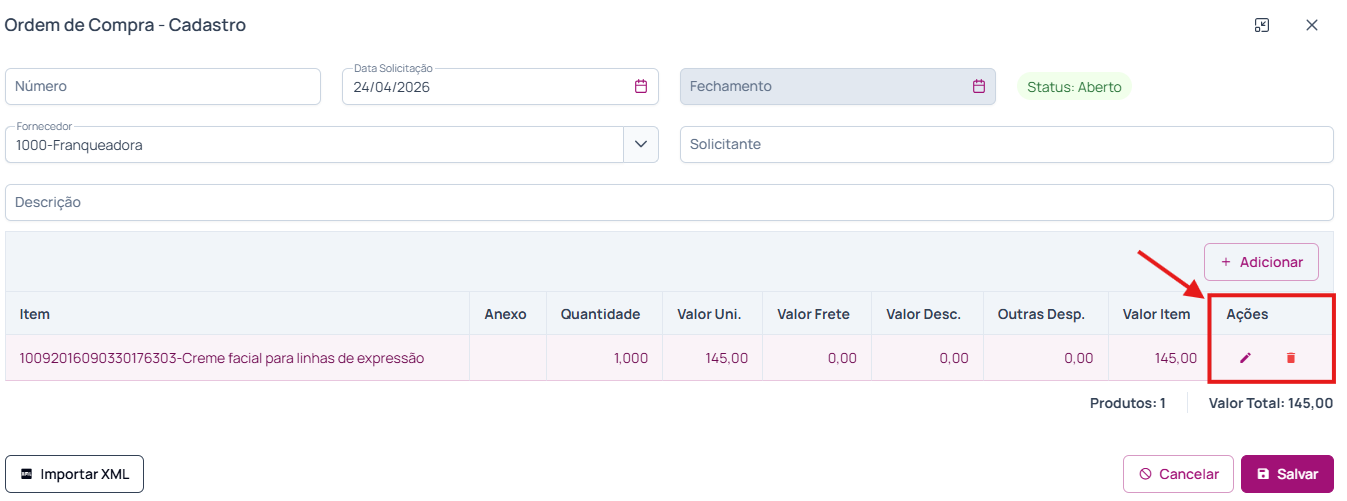 Em itens da ordem de compra você encontrará três opções: Adicionar, Modificar e Remover itens.