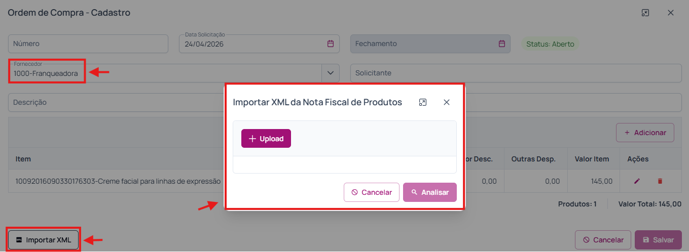 Incluir Ordem de Compra pelo XML da Nota Fiscal