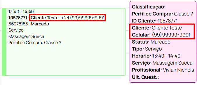 - Agenda: ao clicar sobre o agendamento, no quadro de informações em que é exibido o celular do cliente, essa informação ficará oculta;