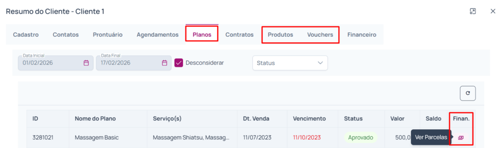 Ainda na tela de “Resumo do Cliente”, nas demais guias de “Planos”, “Pedidos/Produtos” e “Vouchers”, que permitem ao usuário consultar as parcelas daquela venda, quando a restrição é aplicada, o usuário não terá acesso a coluna com o botão para consultar as parcelas nessas três guias:
