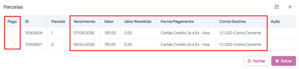 Na tela de “Consultar Parcelas” (disponível ao consultar as parcelas de uma venda, seja de venda de planos, serviços ou agendamentos, produtos no pedido de venda…), se a restrição for aplicada, o usuário poderá apenas consultar as informações exibidas nessa tela, sem poder editar ou confirmar o recebimento: