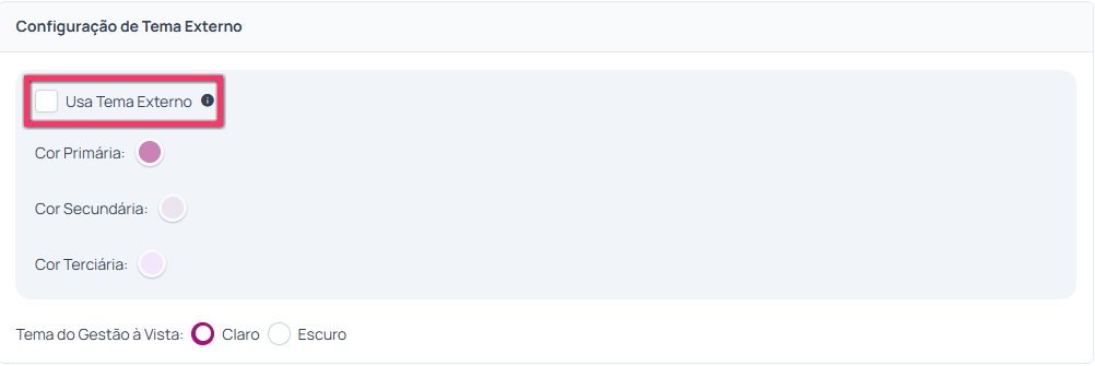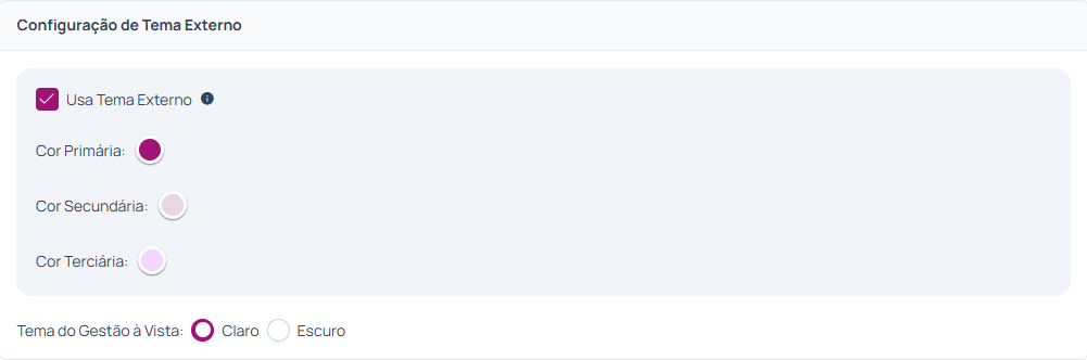 Caso não marque a opção de “Usa Tema Externo” as cores do tema ficarão conforme o que fica exibido por padrão, com tons de roxo:
